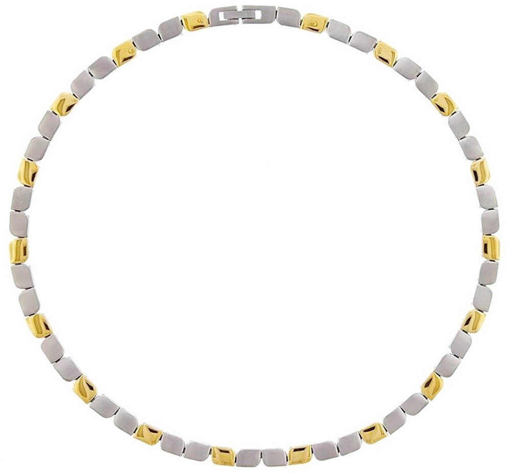 Materiaal: Titanium Kleur: goud- zilverkleurig Schakel: fantasie, mat en glanzend afgewerkt Lengte : ca 45cm