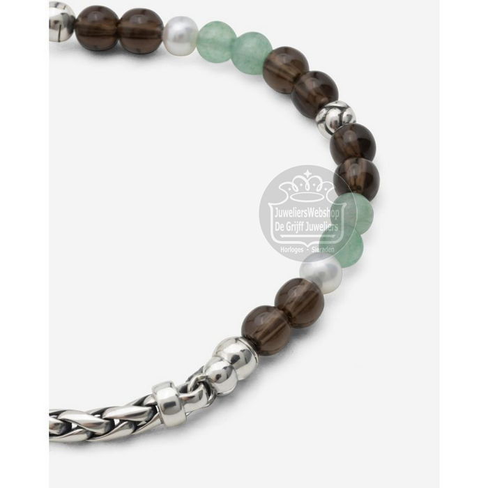 - artikel nummer 038AV C-E- Spirit Bead Stacking Bacelet- Gevlochten schakels- Steensoort: Aventurine, Smokey Quartz, zoetwaterparel- 925 Sterling Zilver- Dikte: ca. 4 mm- Lengte 16-19cm- Hanger met Buddha to Buddha logo bij sluiting- Cartiersluiting
