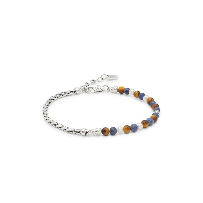 - artikel nummer 038TIS C-E- Spirit Bead Stacking Bacelet- Gevlochten schakels- Steensoort: Tijgeroog, Sodaliet, zoetwaterparel- 925 Sterling Zilver- Dikte: ca. 4 mm- Lengte 16-19cm- Hanger met Buddha to Buddha logo bij sluiting- Cartiersluiting