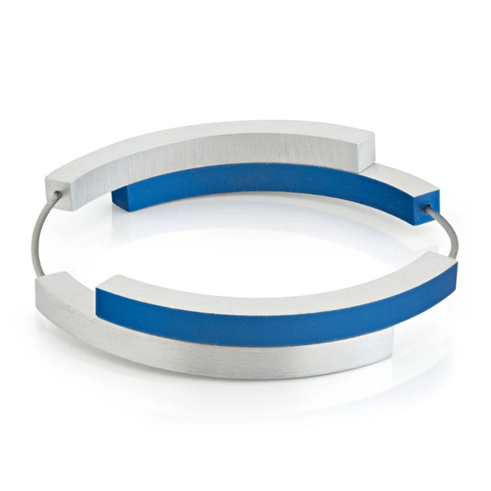 Een bijzondere armband die bestaat uit vier bogen die aan elkaar zijn verbonden door een draad van edelstaal. De bogen zijn uitgevoerd in aluminium, waarvan er twee mat blauw geanodiseerd zijn en twee mat zilver (zilverkleurig). De magnetische sluiting zit verwerkt in de twee over elkaar liggende bogen. De armband valt ovaal om de pols.