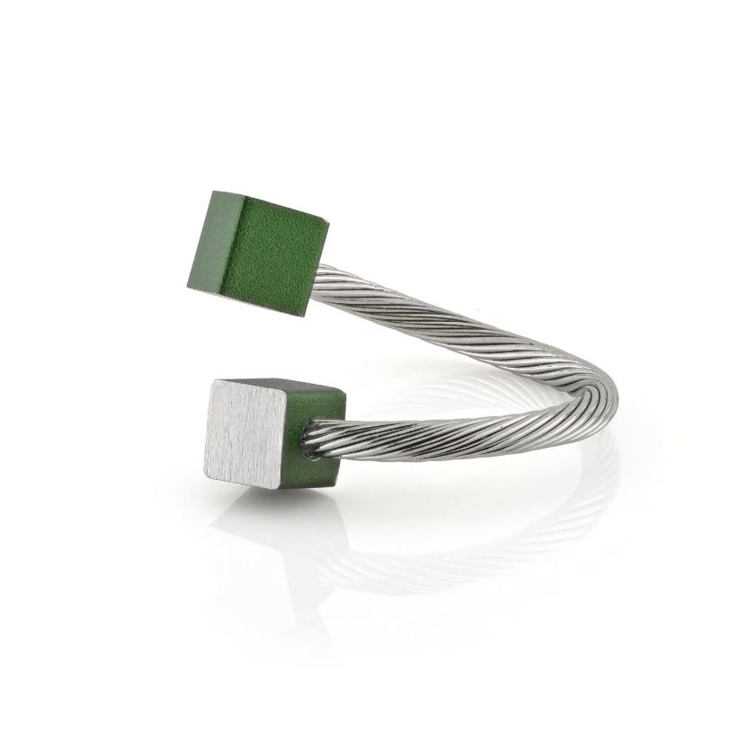 ??One size fits most?? Materiaal: aluminium blokjes aan veerring van edelstaal Afwerking: mat, groen Afmeting blokjes: 5x5x5mm Maat: ring is te vormen naar de gewenste maat