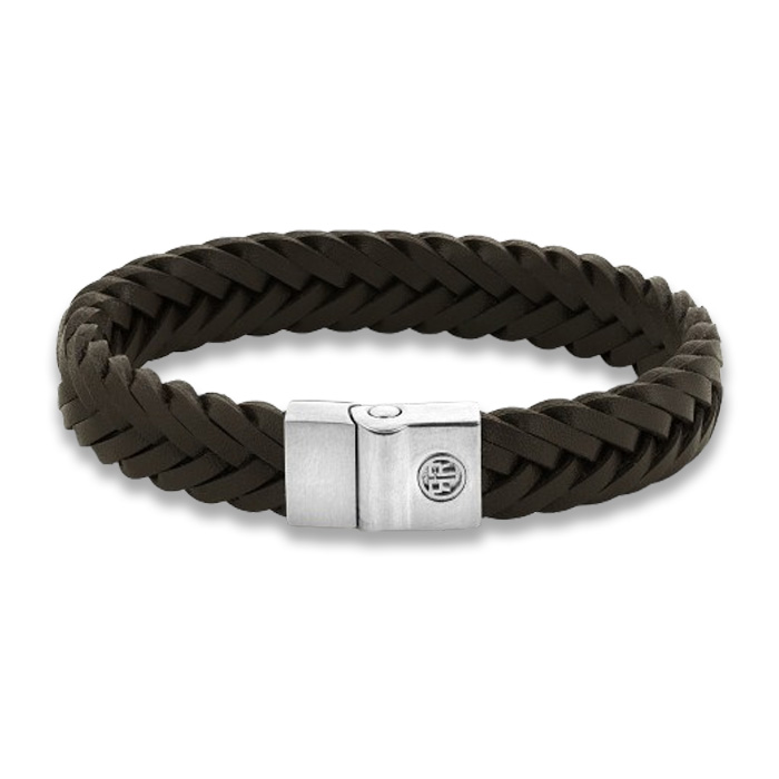 - Full Metal Leather serie- Artikelnr: RR-M0060-S-M- Materiaal: leer, gevlochten- Kleur: Donkerbruin- Stevige en solide sluiting van edelstaal- Lengte: 17,5cm- Breedte: 12mm