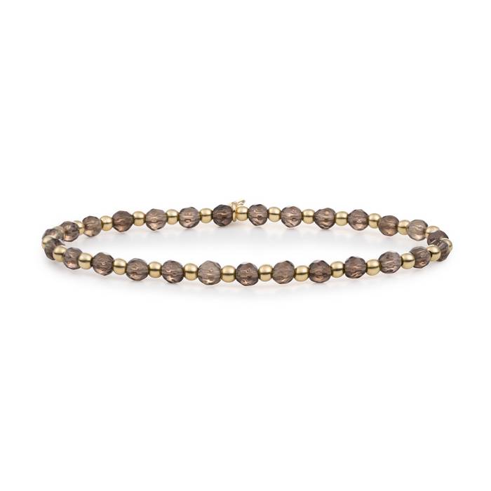 -Naam: Smoky Quartz Interstellar Gemstone Bracelet-Artikelnr: SBG-GEM23-3MM-MIX-Maat van de armband: 18,5 cm-Maat van de zilveren kralen: 3 mm-Maat van de edelsteen kralen: 4 mm-Materiaal: sterling zilver, verguld-Kleur: geel verguld, glanzend afgewerkt-Steensoort: kwarts-Bewerking: gefacetteerd-Kleur: Bruin