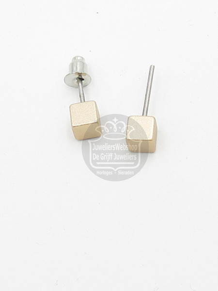Artikel: oorknop, oorsteker, oorsieraad Vorm: blokje, kubusje Materiaal: staal, aluminium Afwerking: mat, geanodiseerd Kleur: Geel verguld Doorsnede: 5mm