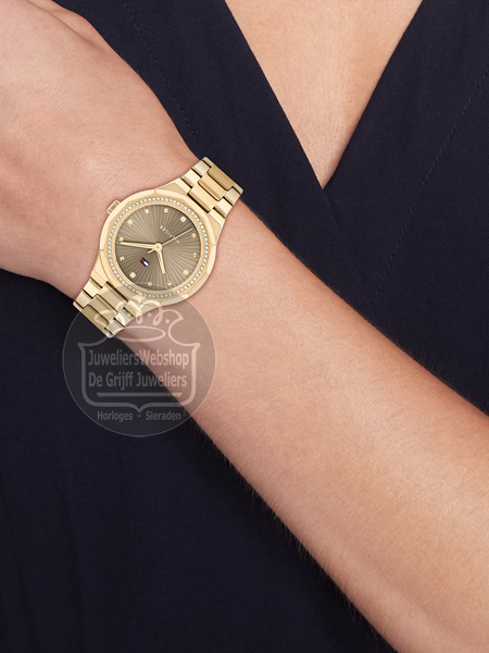- Stalen schakelband, verguld- Kleur band: goud- Vouwsluiting- 3 atm waterdicht (spatwaterdicht)- 2 jaar garantie- Levering in originele Tommy Hilfiger watch-box